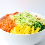 In a large bowl, combine cucumber noodles, peppers, carrots, peanuts, basil, and cilantro.